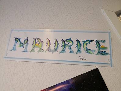 23. Sept. 2018 Da wir immer viel mit der Intensivpflege zu tun haben, sind durchgehende Einträge hier nicht immer möglich. Wir haben Maurice soweit stabilisiert. Leider liegt er immernoch im Pflegebett im komatösen Zustand, er kann uns aber teilweise hören. So kann er uns antworten, das er weiter kämpfen will, so wie wir alles tun was irgend geht. Das sedative Methadon ist abgesetzt, mom. kämpfen wir ums Aufwecken. Maurice wir weiter behandelt mit div. Ärzten. Eine Chance zu haben werden wir ihm nicht nehmen! Seine treue Freundin Jana kommt ihn regelmässig besuchen, sie brachte ihm ein selbstgemaltes, individuelles Namenschild aus Delphin-Bildern (Foto) aus dem Urlaub von Ägypten mit. Danke, liebe Jana. --- Vom rabiaten "Pflegedienst" mußten wir uns trennen, dieser erschien weder pünktlich noch regelmässig, kein Verlust für uns, im Gegenteil, so einen "Hauskranken-Pflegedienst" möchte man nicht mal umsonst haben.